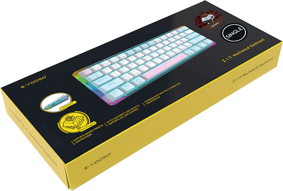 E‑Yooso Z‑11T – tai mažo dydžio, bet didelio potencialo klaviatūra, sujungusi greitį, stilių ir universalumą į vieną kompaktišką sprendimą. Puikiai tinka tiems, kurie nori patikimos, išskirtinės ir funkcionalios mechaninės klaviatūros kasdieniam naudojimui ar žaidimams.